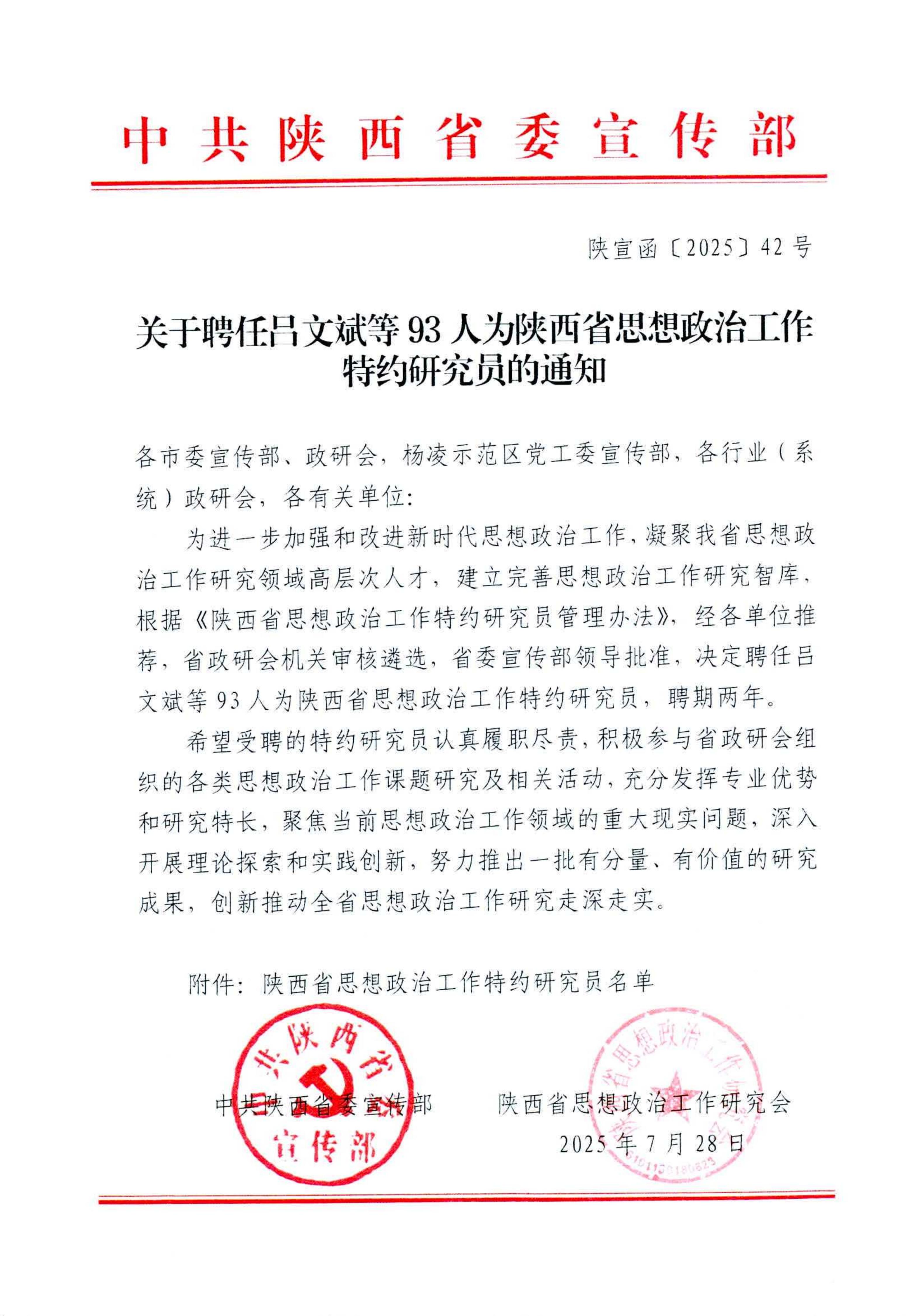 近日,根据《陕西省思想政治工作特约研究员管理办法》,经各单位推荐,省政研会机关审核遴选,省委宣传部领导批准,我校tyc86太阳集团院长窦红莉被聘任为陕西省思想政治工作特约研究员,聘期为2年。